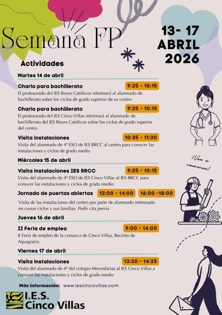 El IES Cinco Villas organiza del 13 al 17 de abril de 2026 la Semana de la Formación Profesional, una iniciativa destinada a dar a conocer la oferta educativa de FP del centro, acercar el mundo profesional al alumnado y fortalecer la colaboración con otros centros educativos y el entorno empresarial de la comarca.